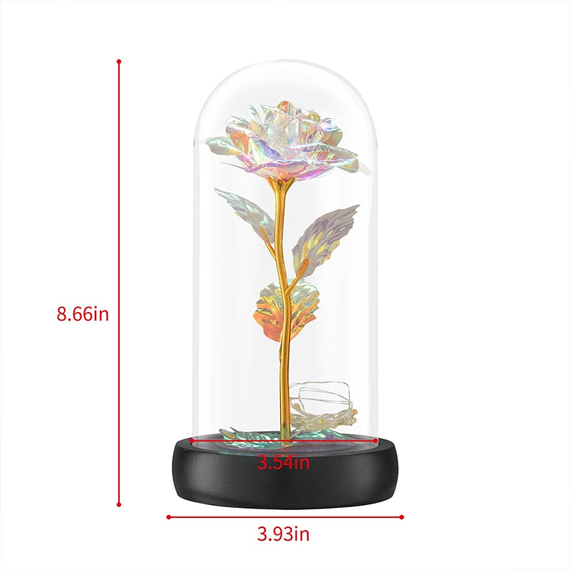 Material: Galaxy Rose/Gold Foil Rose, Glass Dome, Wooden Base